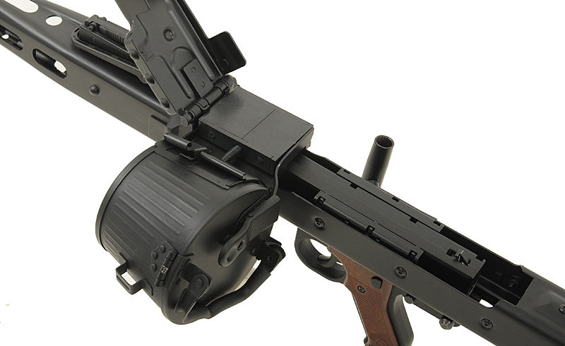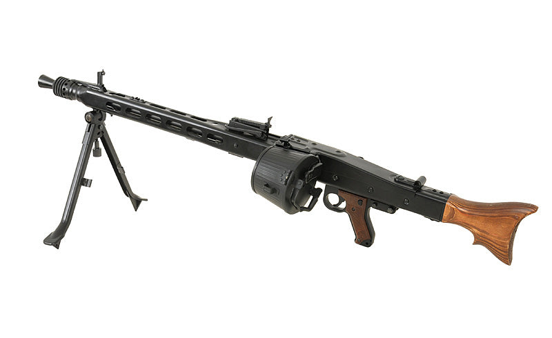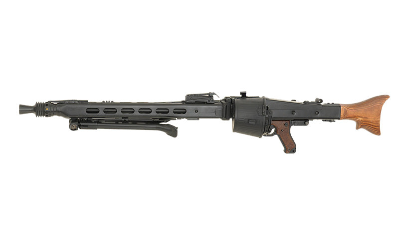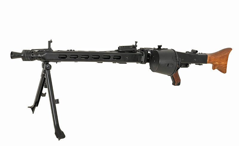The MG42 is an airsoft replica based on the German machine gun (Maschinengewehr 42), known for its historical significance. Meticulously designed and crafted, this replica pays homage to the original while catering to airsoft enthusiasts' needs and are made retro aged to let them be shown as used.