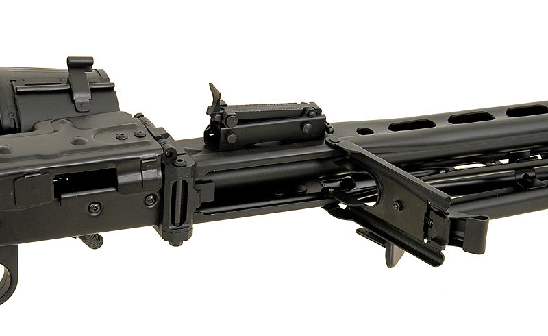 The construction of the replica has been meticulously designed with attention to detail, faithfully replicating the appearance of the Maschinengewehr 42. Its construction is primarily metal, encompassing various elements such as the muzzle brake, barrel with cover, front sight mounting base, trigger guard, bolt chamber with bolt cover, folding rear sight, and rear sight guard, predominantly made from metal. Additionally, steel components include the bipod, barrel changing lever, bolt handle, and the base for the sight with an anti-aircraft notch.