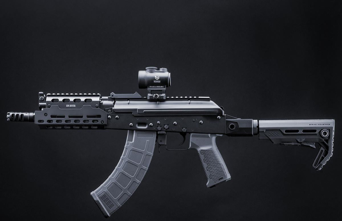 The Strike Industries TRAX series brings new life and utility to the tried and true AK74 platform. At the heart of this lineup of rifles is the Strike Industries licensed AK TRAX modular handguard which is a versatile, lightweight aluminum MLOK system allowing attachment of all types of tactical accessories. The SI TRAX AK's come with a steel outer barrel for added weight and realism, along with an aggressive muzzle brake. A 20mm rail sits atop the steel dust cover, allowing for streamlined mounting of tactical optics.