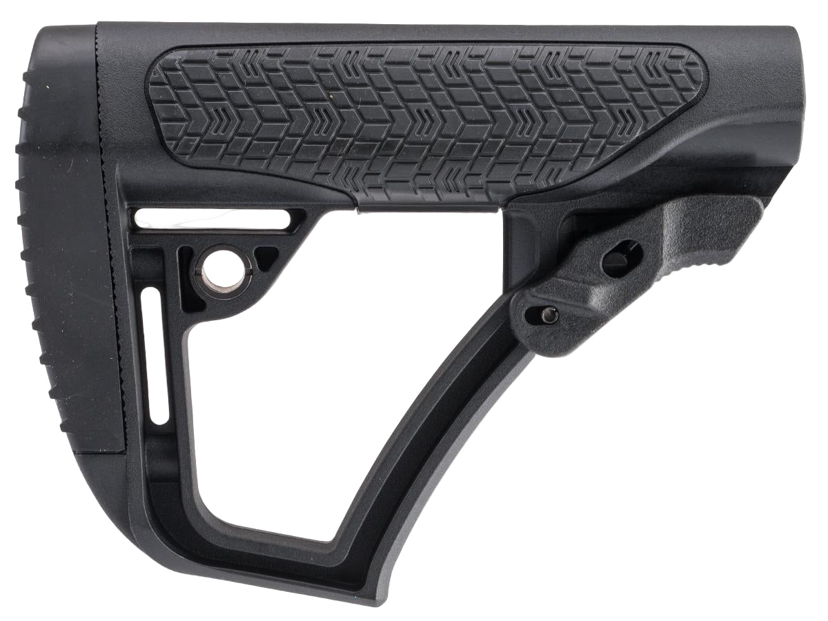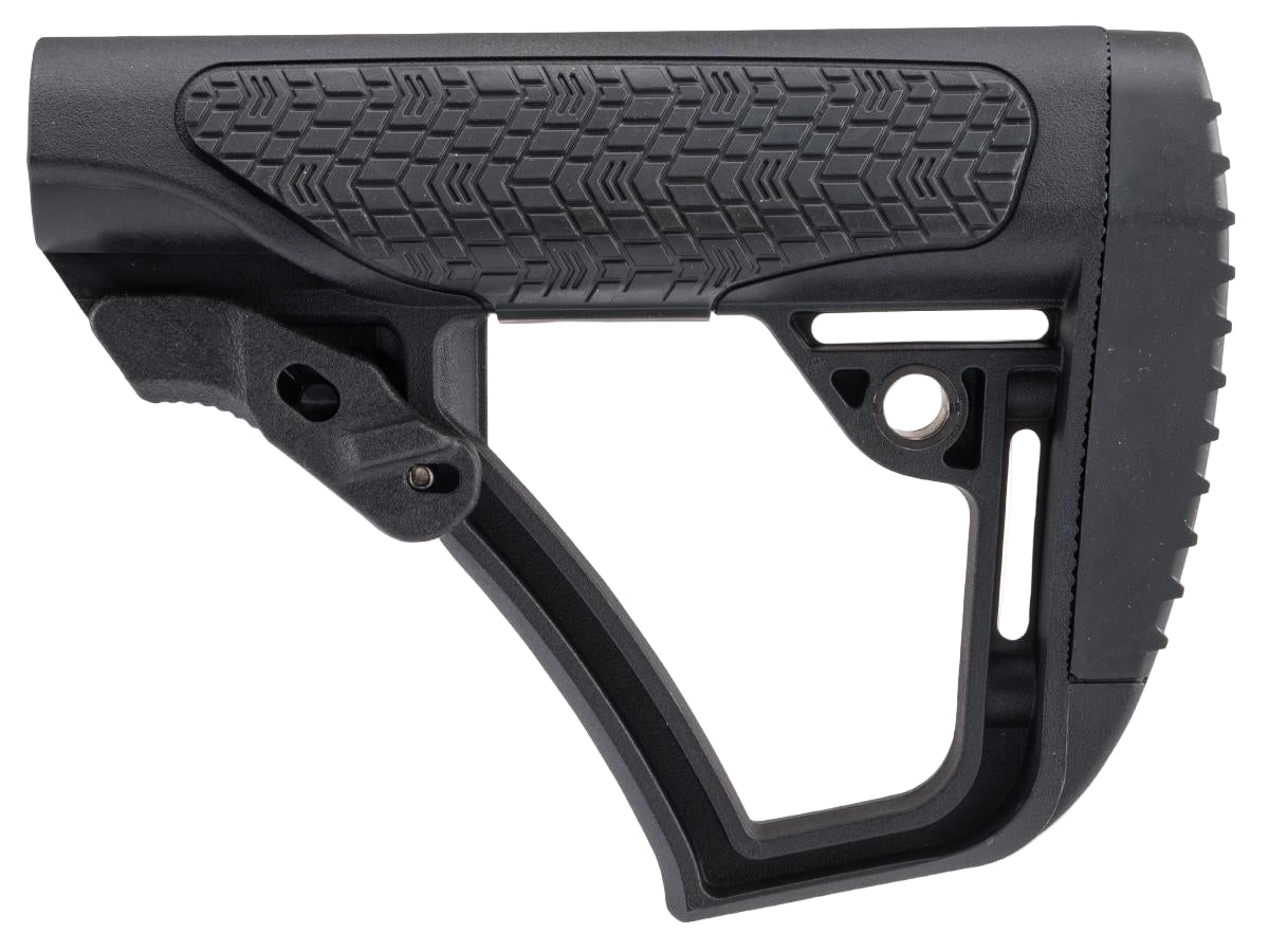 The Daniel Defense adjustable buttstock is constructed of a proprietary blend of glass infused polymers and finished off with soft touch rubber over-molding in strategic points. The new buttstock is precision formed for mil-spec receiver extensions to have very little forward or lateral play that is so common in many other buttstocks. This eliminates the need for a tensioning device or friction lock. All of this results in a durable buttstock that will give the shooter a comfortable and repeatable cheek weld and unprecedented control of the firearm. The buttstock includes a thinner concave shape (0.5") designed for comfortable snag-free shouldering, and is also compatible with the thicker convex shape pad (0.8", not included). Limited rotation QD swivel attachment points are integrated on both sides of the buttstock for ambidextrous sling connection.