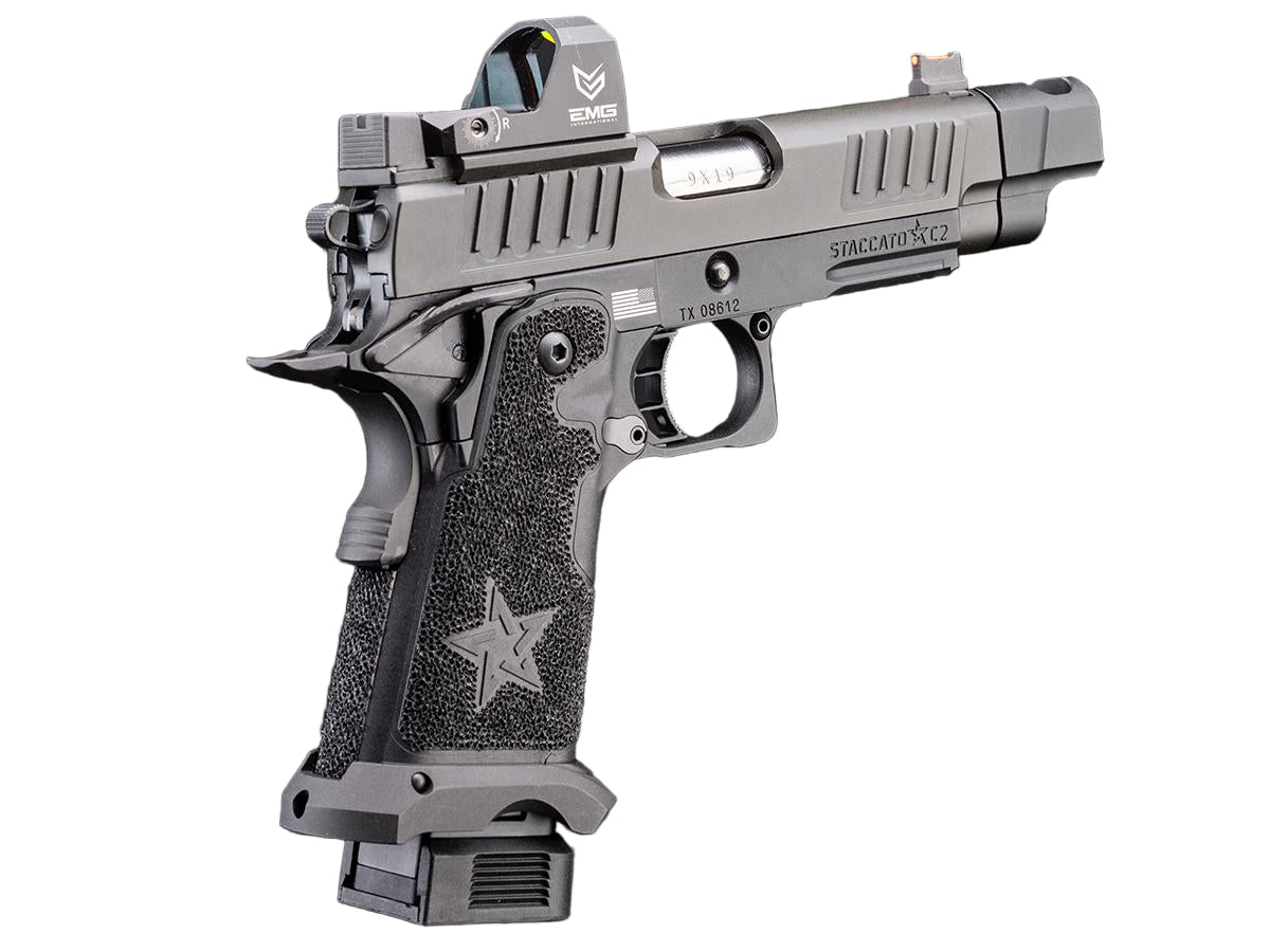 The Staccato C2 has quickly redefined what's possible with a compact carry gun. The C2 is finely crafted with wide lightening cuts at the front and rear of the slide providing superior grip while racking it back, reduced recoil and improved cycling speed. The slide is RMR ready and comes with an RMR plate for the installation of your favorite reflex dot sight. Additionally, slide comes equipped with a fiber optic front sight and a tall rear sight that allowing continued functionality when a reflex dot sight is installed. The C2 metal frame is a robust and nicely weighted for a more realistic look and feel and comes with an under barrel accessory rail for your favorite lights or lasers. Preinstalled is a hand-stippled polymer grip which provides a comfortable and secure hold. Other features include a skeletonized trigger and textured trigger guard continuing to provide more stability while firing. The icing on this cake is the authentic licensed logos, patterns and roll marks of Staccato.