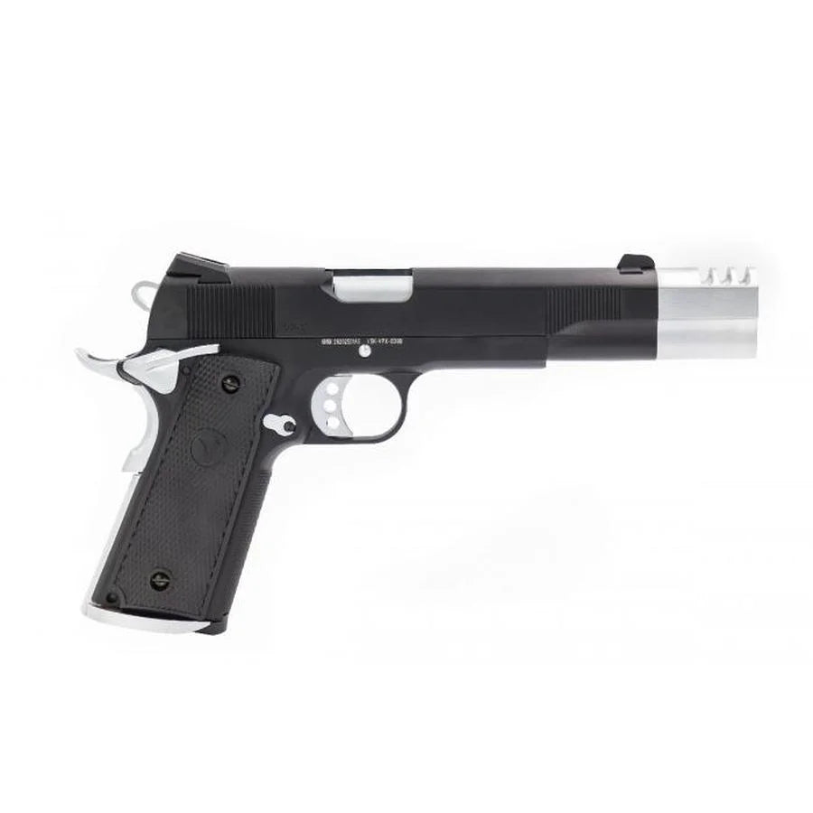 Introducing the VP-X, the newest offering from VORSK. The VORSK VP-X is a hybrid Gas-Blow-Back 1911/MEU handgun that is made to look like the 1911. It has a custom VORSK compensator, VORSK pistol grips, and a sophisticated dual-tone colour scheme.