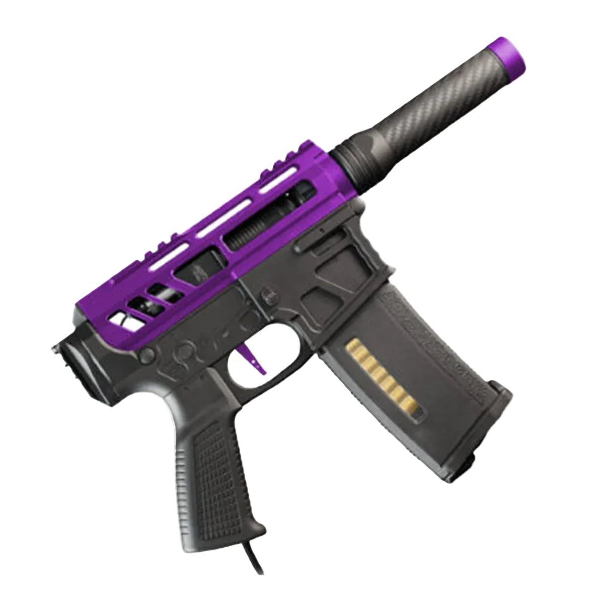 Heretic Labs propose l'instrument HPA Speedsoft ultime. Dans l'Article I, seul le nécessaire à la performance est inclus, s'affranchissant du poids des normes militaires. L'ensemble comprend une carcasse MTW robuste mais squelettisée, usinée sur commande numérique, en aluminium. Finis la poignée d'armement, le tube tampon et la crosse. À la place du rail, le canon extérieur en fibre de carbone véritable allège l'avant du pistolet, qui pèse 950 g.