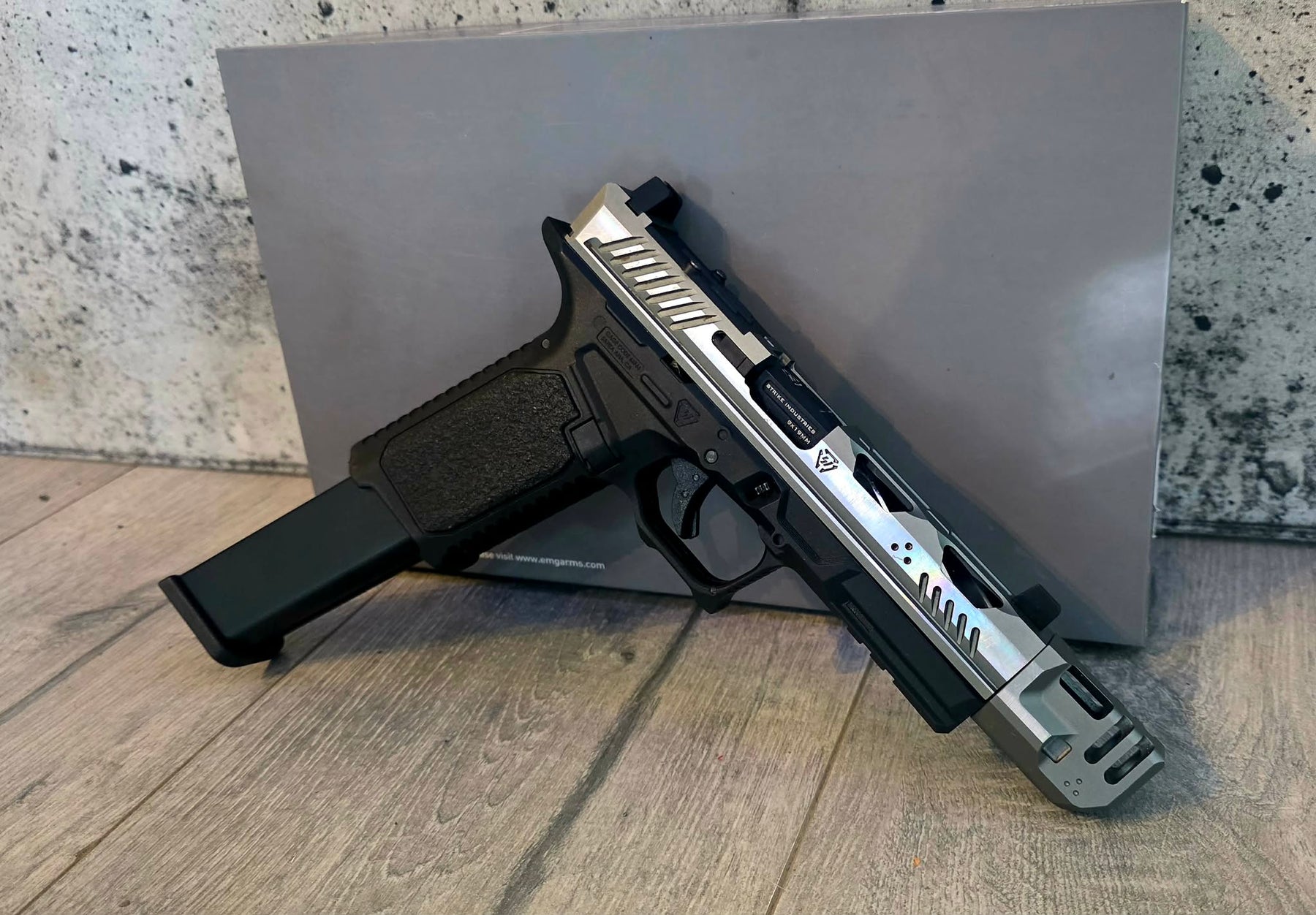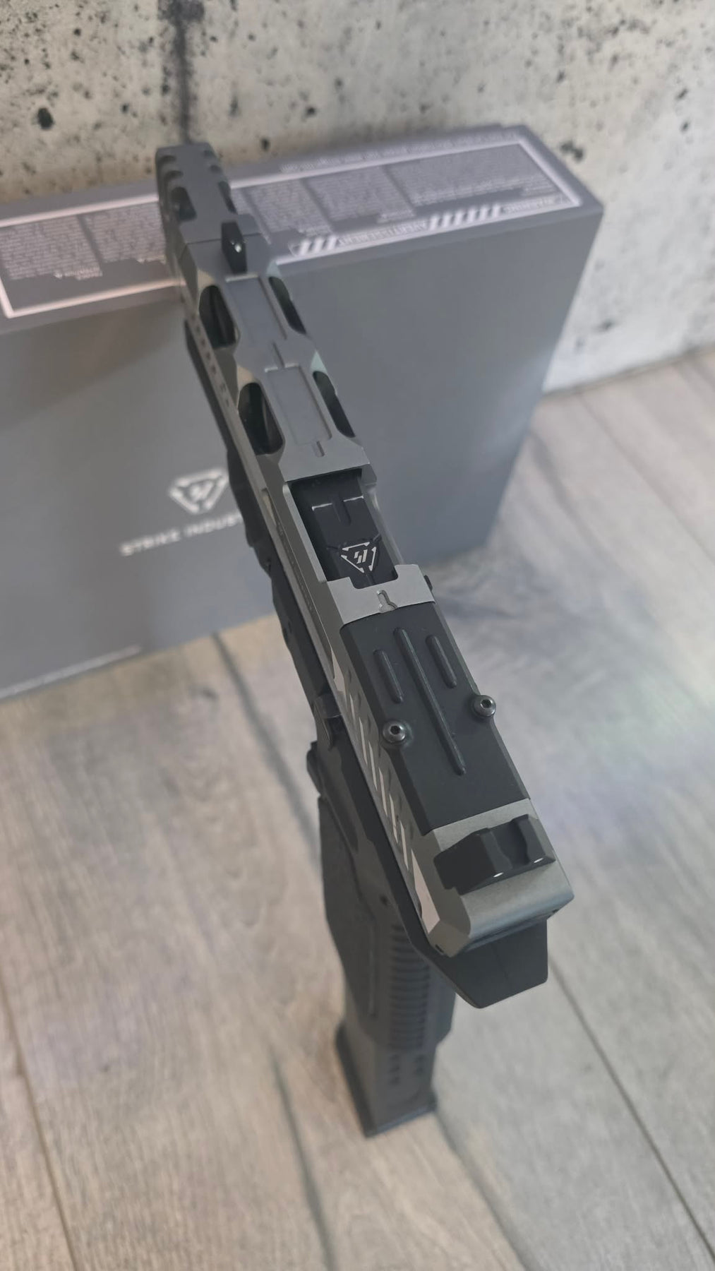 The Strike Industries ARK pistol by EMG has been designed with the same performance characteristics as SI's real firearm ARK components. The sleek slide has been lightened throughout with various cuts, which translates nicely to the Airsoft platform, providing a crisp firing action. Suppressor-height front and rear sights give the user a clean, easy to acquire sight picture, and the outer barrel is fluted for lightness and added aggressive design characteristics. The rear of the slide features a dot sight cutout for extra realism when compared to the real SI ARK slide (dot sight compatibility to be announced).